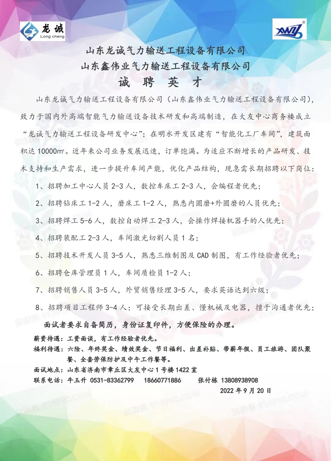 Description:山東龍誠(chéng)氣力輸送工程有限公司(山東鑫偉業(yè)氣力輸送工程有限公司)致力于國(guó)內(nèi)外高端智能氣力輸送設(shè)備技術(shù)研發(fā)和高端制造。近年來(lái)公司業(yè)務(wù)發(fā)展迅速,訂單飽滿,為適應(yīng)不斷增長(zhǎng)的產(chǎn)品研發(fā)、技術(shù)支持和生產(chǎn)需求,進(jìn)一步提升車間產(chǎn)能,優(yōu)化產(chǎn)品結(jié)構(gòu),現(xiàn)面向社會(huì)誠(chéng)聘英才。